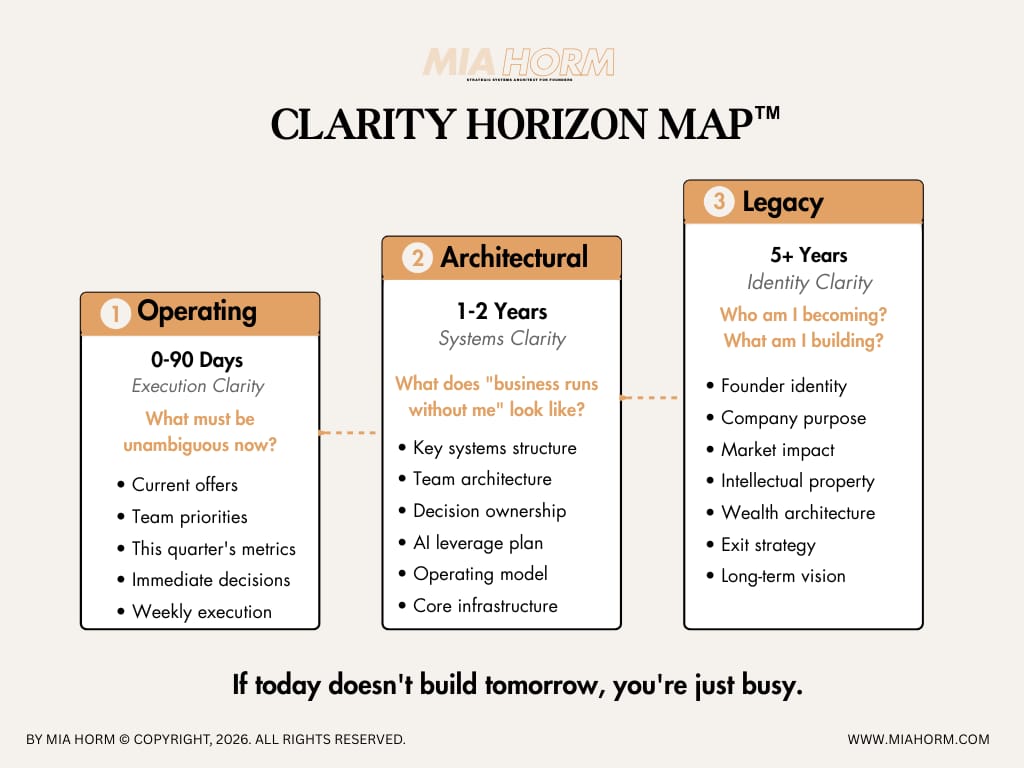 AI accelerates execution. That makes bad sequencing more expensive. When you train AI on today's problems, you encode today's thinking into systems that will run for months. The output compounds the error. Founders burning cycles on short-horizon work wonder why their AI outputs feel reactive, fragmented, or tactically sharp but strategically empty. The issue lives upstream. AI mirrors the decision architecture you feed it. If your thinking operates in single-horizon mode, your AI will too. Horizon clarity is the variable. Three-month problems require different prompts than three-day problems. The Clarity Horizon Map separates them before you waste context windows solving the wrong thing first.